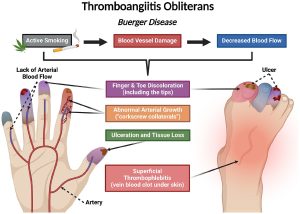 Thromboangiitis develops due to inflammation and clot formation in blood vessels. Key contributing factors include: